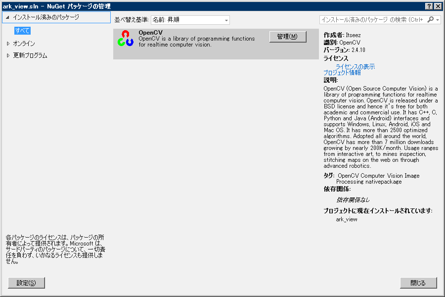 下のような画面が出ますので、「オンライン」→「OpenCV」で検索すると候補に上がってきますのでクリックすればインストールできます。